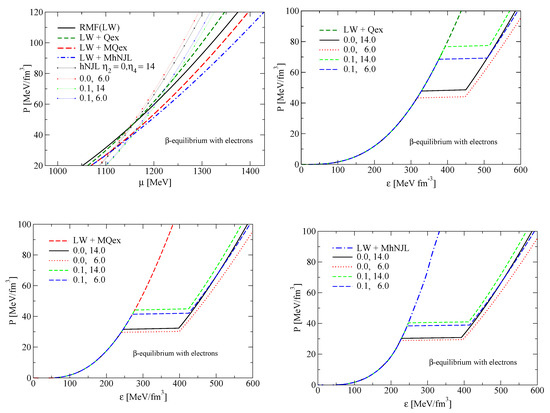 In the remaining three panels of Figure 10 we show the pressure as a function of the energy density for the 12 hybrid EoS models resulting from the combination of the three hadronic EoS: LW + Qex (upper right panel), LW + MQex (lower left panel) and LW + MhNJL (lower right panel) with the four quark matter EoS for the model parameters of the hNJL model: and The other parameters of the hNJL model are fixed to values of [25], see also Section 3.2 above.