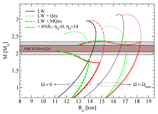 In the same plot we also show the relationship between mass and equatorial radius for stars rotating with the maximum possible angular velocity. These calculations have been performed within the slow-rotation approximation described in detail in [34,35].