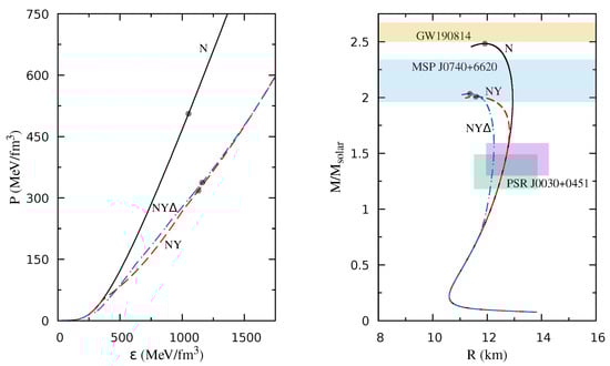 Left panel: Equation of state (EoS) of matter in the absence of magnetic field for three compositions considered. Solid, dashed, dash-dotted lines correspond to the cases of nucleons only (N), nucleons and hyperons (NY), nucleons, hyperons and Delta (NY), respectively. The circles indicate the location of the maximum mass star for each composition. Right panel: the mass–radius (M–R) relations corresponding to the EoS on the left panel obtain through solutions of the TOV equations. The mass constraints from the various astrophysical observations are represented by the colored bands and correspond to the GW190814 event [32], MSP J0740+6620 [31] and the mass–radius limits inferred for PSR J0030+0451 from the Neutron star Interior Composition ExploreR (NICER) experiment [33,34].