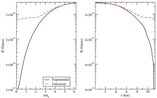 Magnetic field profiles for the NY composition as a function of baryon number density, n (left panel) and internal radius r (right panel). Black solid, red dash-dotted lines denotes exponential and universal profiles, respectively.