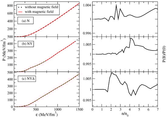A comparison of the EoS of magnetized and non-magnetized matter for three different compositions (a) nucleons only (N), (b) nucleons and hyperons (NY) and (c) nucleons, hyperons and -resonances. We assume an exponential magnetic field profile. Left panels show the dependence of pressure on energy density with (solid lines) and without (dots) magnetic field. The right panels the ratio of pressure in the presence of magnetic field to that in the absence of the field as a function of particle number density normalized to the nuclear saturation density.