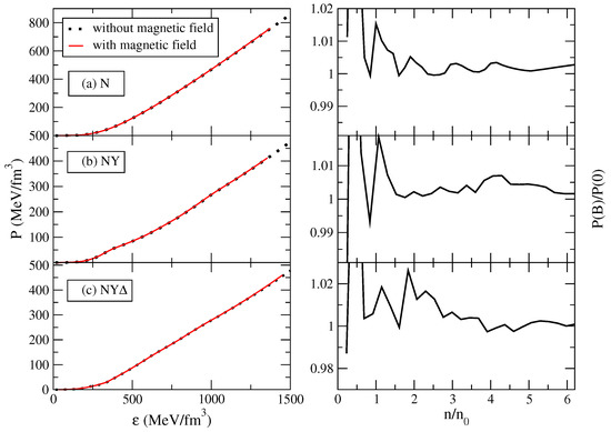 Figure 3 and Figure 4 show the EoS in the presence of magnetic field for various compositions. In all the cases studied, it is seen that the EoSs follow the same trends with and without magnetic field. For the assumed values of the field, the changes in the EoS are marginal if viewed on the plots shown on the left panels of Figure 3 and Figure 4.