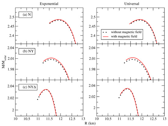 As a result of the additional pressure due to the magnetic field, the EoS is stiffened and, consequently, the maximum masses of magnetized compact stars are higher compared to their non-magnetized counterparts. This can be seen from Figure 5, where the corresponding M–R relations are displayed. More quantitatively, we find that for the N-composition the increase in maximum mass due to the effect of the magnetic field is about , in the case of NY-composition for the exponential profile and for the universal profile and, finally, for the NY-composition, about for the exponential profile and for the universal profile. We note that in the case of NY-composition the EoS is softer at high densities, than in the case of NY-composition. Therefore, the effect of the magnetic field is more sizable in the case of the softer EoS, i.e., for the NY-composition. Thus, we conclude that the changes in the maximum mass are more pronounced in the case of NY-composition and are less significant for the NY-composition.