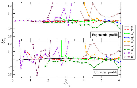 Dependence of the ratio on the baryon number density normalized to the nuclear saturation density for neutrons , protons , , , , , , and . The particle markers are indicated in the panel on the right. The upper panel corresponds to the exponential field profile, the lower one to the universal field profile.