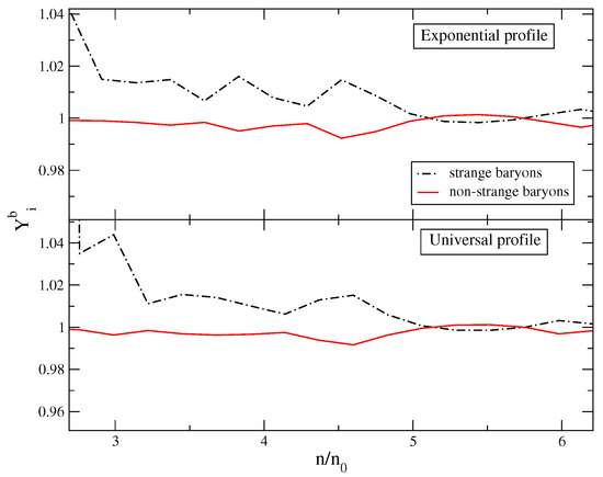 Figure 6 shows the ratio of fractions of different species as a function of normalized baryon number density. The oscillating nature of the fractions arises due to successive occupation of Landau levels for the charged species. The effect of the field is not substantial in the low-density regime for exponential field profile as the field strength in this case is small near the surface. In the case of the universal profile, the low-density regime shows strong fluctuations because the decay of the magnetic field with density is small and the surface magnetic field is of the order few times of G (see Figure 2). It is interesting to note that for most of the particles , but in the case of , the opposite is the case. This is a consequence of the charge neutrality. Due to the Landau quantization the fraction of electrons increases compared to non-magnetic case which causes the fraction to decrease. The pattern in Figure 6 results from the complicated interplay between the Landau quantization for charge particles entering into the two key conditions imposed—the charge neutrality and baryon number conservation, which are used in the construction of the EoS. Note also that and resonances do not appear until baryon density of for our particular choice of -potential.