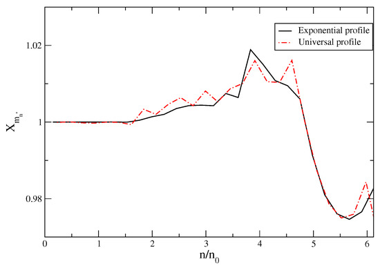 Finally, to quantify the variations of the effective mass of a baryon in the presence of magnetic field, we show in Figure 8 the ratio of effective nucleon Dirac mass () in the magnetic field to its value in the absence of the field . It is seen that, for the exponential profile case, remains unchanged until the appearance of around times nuclear saturation density. A similar trend is observed for the universal profile case, but the amplitudes of the oscillations are larger. This is (again) due to the fact that the magnetic field value at the surface of the star is larger for this profile. With the onset of , we observe a reduction in by about in the density range ∼4–5 times saturation density for both the profiles.