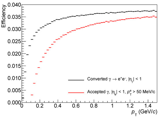 The studies of the photon conversion probability were performed with the GEANT4 package coupled to the official MpdRoot framework used for Monte Carlo simulations of the MPD detector response, track reconstruction, and pattern recognition. The photon conversion probability is shown in Figure 1 as a function of the photon transverse momentum for photons in the central pseudorapidity range . The conversion probability rapidly grows towards a higher momenta and reaches a plateau of about 3.5% at GeV. As shown in Figure 1, an application of fiducial selection criteria on the transverse momentum ( MeV/c) and pseudorapidity () of conversion electrons and positrons results in a reduction of the fraction of accepted photons, mainly at a low transverse momenta.