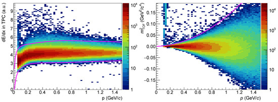 (Left) Distribution of energy losses in the time projection chamber (TPC) for electrons as a function of momentum. (Right) Distribution of reconstructed squared mass in the time-of-flight (TOF) for electrons as a function of momentum. Selection limits are shown with magenta lines.