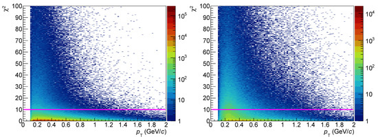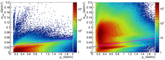 Background pairs of tracks can be further suppressed using the selection on the invariant mass of the pair assuming electron mass hypothesis for daughter tracks. Distributions of signal and background pairs as a function of invariant mass and transverse momentum of the reconstructed pair are shown in Figure 5. The invariant masses for conversion pairs are close to zero. As for the background pairs, the distribution is much broader though the ridge at small masses is also visible. The ridge corresponds to electron-positron pairs coming from a primary vertex (e.g., from Dalitz decays) and can be suppressed with selection. Since the invariant mass resolution depends on daughter track momenta, we use a -dependent selection: where and are measured in GeV units.