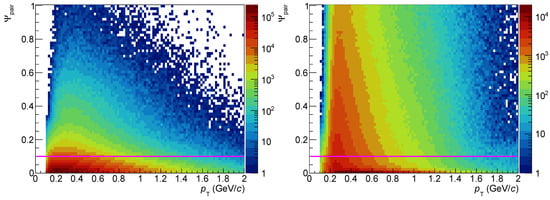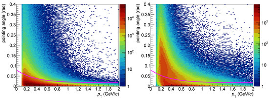 The reconstructed total momentum of electron-positron pairs from converted direct photons should point to the primary vertex. The selection on the pointing angle, i.e., the angle between pair momentum vector and direction to the primary vertex, can be used to suppress the background further. Distributions of signal and background pairs as a function of pointing angle and transverse momentum of the reconstructed pair are shown in Figure 6. The pointing angle resolution improves towards higher transverse momentum of the pair. Therefore the following -dependent selection on the pointing angle was found to be optimal: where is measured in GeV units.