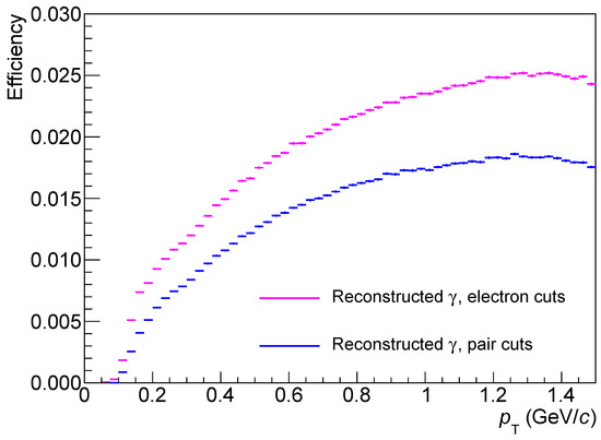 All the selection criteria were carefully optimized using a multivariate technique with the aim to maximize significance of the signal. The reconstruction efficiency after optimized single electron track cuts and after pair cuts is shown in Figure 8. The conversion reconstruction efficiency reaches a maximum of about 1.5%. Contribution of the non-photon background does not exceed 10–20% and can be further improved with tighter selection criteria.
