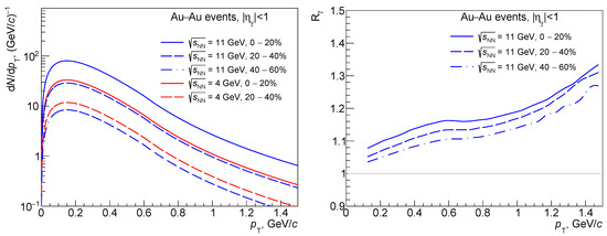 Transverse momentum spectra of direct photons can be also predicted assuming a universal scaling observed by PHENIX in the region GeV [11,15]. Differential direct photon yields in Au-Au collisions at = 4 and 11 GeV were calculated in the region of assuming a dependence as shown in Figure 9, left. In the region of low , direct photon spectra were assumed to follow the thermal spectrum with a conservative effective temperature [12,13].