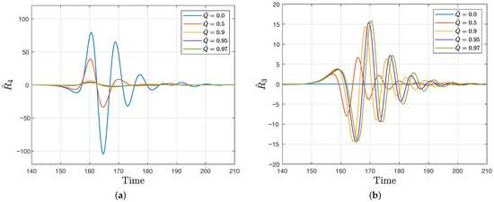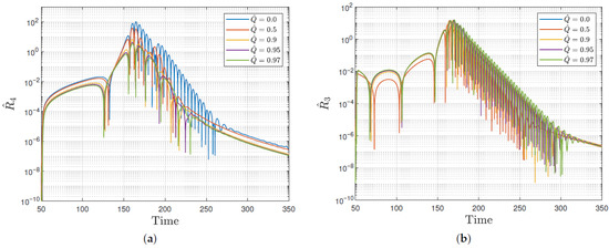 In Figure 1a,b, we show the radial profile for the gravitational and the electromagnetic/gravitational component for the mode , respectively. The simulation was preformed for different values of charge , and . We can observe that the waveforms are quite similar in structure and that the amplitude changes for different values of . The gravitational waveform amplitude is greater and presents more oscillations than that of the electromagnetic/gravitational case. It is interesting to observe that the amplitude decreases for greater values of in the gravitational case. On the other hand, in the electromagnetic/gravitational case, the amplitude increases for greater values of . The time response for both gravitational and electromagnetic/gravitational waveforms starts and finishes at almost the same times.