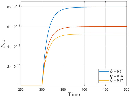 Next, we present the behavior of the energy carried by the gravitational wave for several values of the charge of the infalling matter for the mode (any ), obtained from the energy loss formula, i.e., the power of the gravitational wave, , (see [27]):