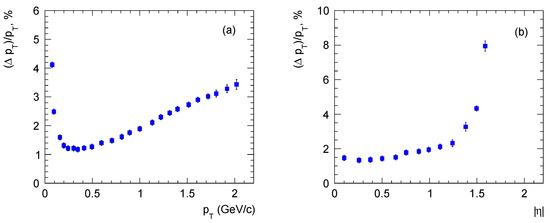 Relative transverse momentum resolution for primary tracks as a function of (a) and pseudorapidity (b).