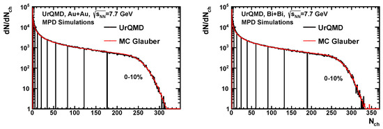 The centrality classes are defined based on the uncorrected charged particle multiplicity () distribution in the TPC for pseudorapidity and full azimuth. As an example, Figure 3 shows the track multiplicity distribution for the Au + Au (left panel) and Bi + Bi (right panel) collisions at = 7.7 GeV compared to those from Monte Carlo (MC)–Glauber simulations (red line) [19]; 10% centrality classes are indicated with black vertical lines in the Figure 3.
