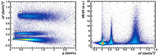 The identified candidates (hadrons and light nuclei) can be selected within the predefined elliptical ranges around a nominal position in dE/dx and axes fixed for each type of particles, see right panel of Figure 4. The widths of these distributions provide an additional criterion of identification. Charged pions and kaons can be easily distinguished up to 1.5 GeV/c in transverse momentum, whereas at higher momenta, the particle species start to significantly overlap. Protons and mesons can be separated up to 2.5 GeV/c.