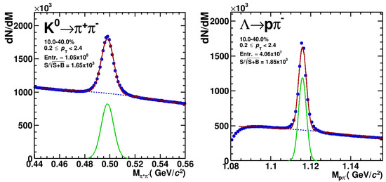 Short-lived weakly-decaying particles, such as and , have been reconstructed using the invariant mass technique. The combinatorial background from uncorrelated particles has been reduced by the selection criteria based on the topology of the specific decay. The topological information about the primary and secondary decay vertex positions, the distance of the closest approach (dca) of the daughter particles to the primary vertex, the dca of the mother particle to the primary vertex, and the dca between the daughter tracks have been obtained by the Kalman filtering algorithm based on the MpdParticle tool [20]. The cuts have been applied to optimize the signal of and particles. As an example, Figure 5 shows the invariant mass distributions for (left panel) and (right panel) particles with GeV/c for 10–40% central Au + Au collisions at GeV.