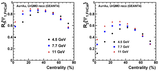 where represents the event plane resolution factor. The two-subevent method with extrapolation algorithm was applied to estimate the event plane resolution factors [21]. Figure 6 shows the centrality dependence of the event plane resolution factors for directed (left panel) and elliptic (right panel) flow measurements for Au + Au collisions at = 4.5, 7.7 and 11 GeV. For the mid-central Au + Au events at = 11 GeV the resolution factor is as high as 0.9—for and 0.65—for measurements. The event plane resolution degrades slowly while decreasing the collision energy.