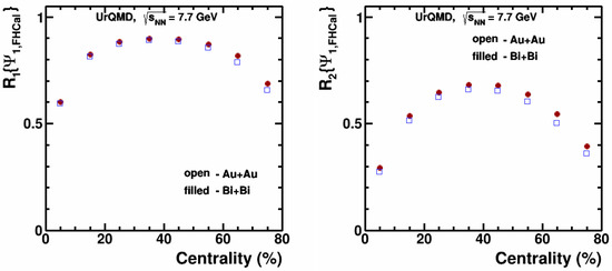 Figure 7 shows the comparison of the event plane resolution factors for the Au + Au (open symbols) and Bi + Bi (filled symbols) collisions at = 7.7 GeV. As expected they have very similar values for the same bins in the collision centrality.