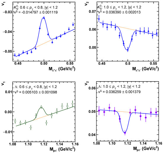 where , and are signal, background and total yields obtained for each interval from fits to the and invariant mass distributions, see Figure 5. Values for signal for and particles were extracted via a direct fit to the for each selection by Equation (4). That is, the background was parametrized as a linear or quadratic function of (depending on the selection) and is taken as a fit parameter. The accuracy of the extraction procedure was verified by checking that the invariant mass () dependencies of the sine coefficients , were all equal to zero within statistical errors. As an example, Figure 8 shows the demonstration of the invariant mass fit method to extract the and signals for (upper part) and (lower part) particles for 10-40% central Au + Au collisions at GeV.