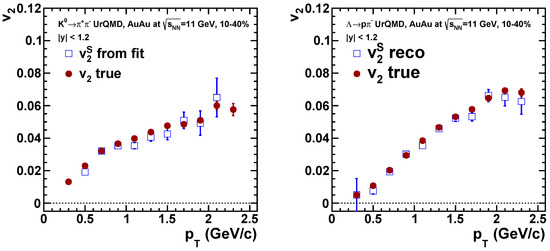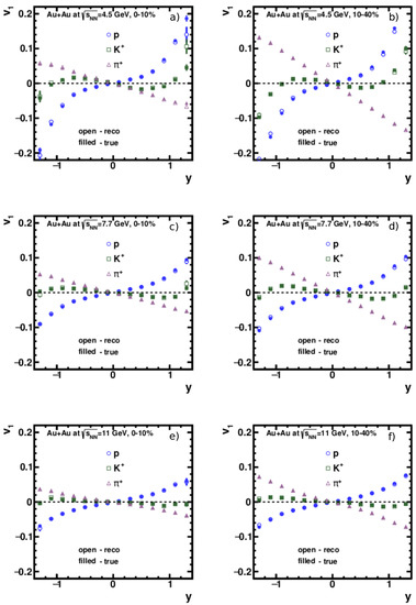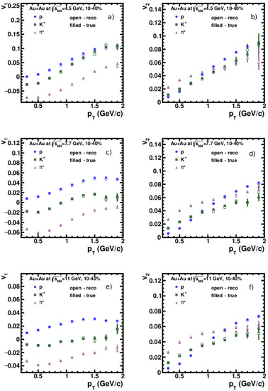 For all particle species, the directed flow crosses 0 at midrapidity. The reconstructed values “reco” of the directed flow are fully consistent with the generated “true” values in all centrality classes and collision energies. The and for identified charged hadrons as a function of transverse momentum are presented in Figure 10 for 10–40% central Au + Au collisions at = 4.5, 7.7 and 11 GeV.
