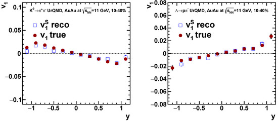Rapidity y dependence of directed flow of of (left) and (right) particles for 10–40% central Au + Au collisions at GeV: open symbols represent the “true” results and filled symbols the “reco” results.
