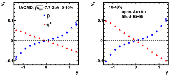 Rapidity y dependence of directed flow of charged pions and protons for 0–10% central (left panel) and 10–40% central (right panel) collisions at GeV. Open symbols represent results for Au + Au and closed symbols for Bi + Bi collisions.