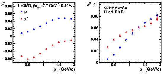 dependence of directed flow (left panel) and elliptic flow (right panel) of charged pions and protons for 10–40% central heavy-ion collisions at GeV. Open symbols represent results for Au + Au and closed symbols for Bi + Bi collisions.