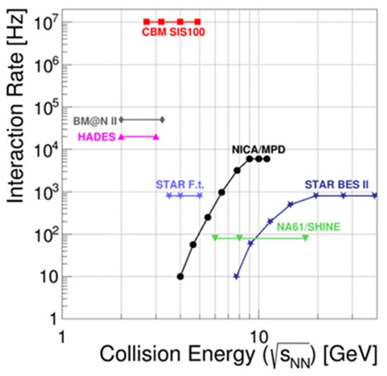 The investigation of the properties of dense QCD matter represents an important field of research at FAIR and NICA. The experimental setups used for these measurements are CBM at FAIR, and MPD and BM@N at NICA. These experiments are complementary, concerning two important features: the collision energy and the reaction rate. These two parameters are plotted in Figure 3 for experiments under construction, such as CBM, MPD, and BM@N, and for running experiments, which also study QCD matter at high baryon densities: HADES at GSI, NA61/SHINE at the CERN-SPS, and STAR at the Relativistic Heavy Ion Collider (RHIC) in Brookhaven, the latter in both collider and fixed target mode [5]. As illustrated in Figure 3, the reaction rates at the NICA and RHIC colliders decrease with decreasing collision energy as the luminosities fade away, while the reaction rates of the fixed target experiments are essentially limited by the rate capability of the detector setups. In particular, the detectors and the data acquisition of the CBM experiment are optimized for extremely high reaction rates, of up to 10 MHz, in order to collect high statistics data for rare probes and multi-different observables. In contrast, MPD at NICA covers the energy range accessible by CBM and STAR. For Au ions, SIS18 (HADES) reaches beam kinetic energies of up to 1.23 A·GeV, while the Nuclotron (BM@N) covers energies up to 3.8 A·GeV.