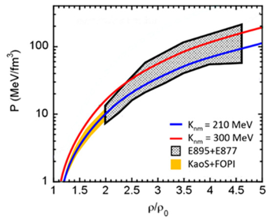 The transverse and elliptic flow of protons has been also measured in Au + Au collisions at beam kinetic energies between 2 A·GeV and 11 A·GeV at the AGS in Brookhaven [11]. At these beam energies, baryon densities of more than 5 ρ0 can be reached, like in the core of neutron stars. The data have been analyzed by relativistic transport model calculations, which found the transverse flow data are in agreement with a soft EOS (Knm = 210 MeV), while the elliptic flow data are compatible with a stiff EOS (Knm = 300 MeV) [12]. The resulting constraint for the high-density EOS for symmetric nuclear matter, plotted as pressure versus density, is depicted in Figure 4 by the grey shaded area. For comparison, a soft (blue line) and a hard (red line) EOS are also shown, together with the FOPI and KaoS results (yellow area). The figure clearly demonstrates that the EOS for symmetric matter is well constrained up to densities of about 2 ρ0, but much less for higher densities, where only very soft or very hard EOS are excluded. Future flow measurements to further reduce the uncertainties are already underway at STAR in the fixed target mode, and will be performed with high precision in future experiments, like CBM at FAIR and MPD and BM@N at NICA.