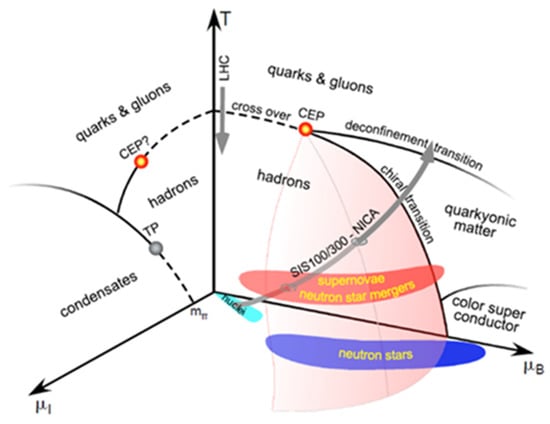 Various neutron star calculations predict a transition from hadronic to quark matter above baryon densities of 4–5 ρ0, when the nucleons start to overlap. Whether this transition is of first order with a mixed phase, as suggested by a non-local 3-flavor Nambu Jona-Lasinio model [16], or a smooth crossover into quark matter, according to the picture of hadron–quark continuity [17,18], is one of the most important open questions in the field of QCD matter under extreme conditions. A hypothetical QCD phase diagram is sketched in Figure 5 as a function of temperature T, baryon-chemical potential μB, and isospin-chemical potential μI. The only known features of this diagram are the locations of stable nuclei, of neutron stars, neutron star mergers, and supernovae. Moreover, the fundamental theory of strong interaction, Quantum Chromo Dynamics (QCD), predicts a smooth crossover from hadronic to quark matter at vanishing baryon-chemical potential at a pseudo-critical temperature of about 156 MeV [19,20]. All the other structures in the phase diagram are conjectures based on model calculations, in particular the existence of a critical endpoint, together with the corresponding first order transition lines separating various phases.