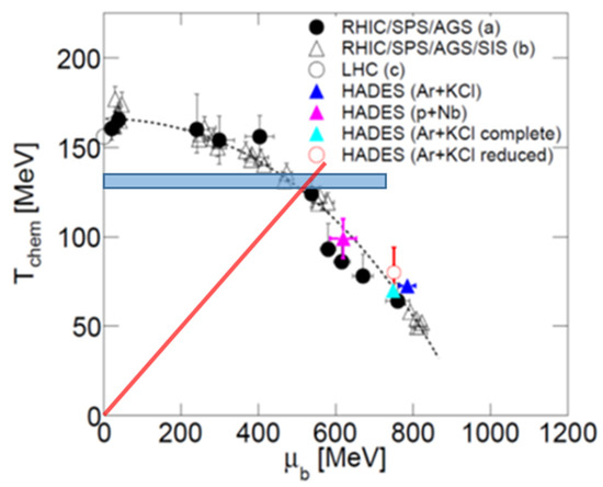 Chemical freeze-out temperatures Tchem as a function of the baryon chemical potential μb extracted from particle yields measured at different energies [24]. The black dashed line is calculated assuming a fixed energy per nucleon of 1 GeV [26]. Blue-shaded area: upper limit for the chiral critical point T0c = 132 + 3 − 6 MeV [21,22]. According to FRG calculations, the location of the chiral critical endpoint is excluded for values smaller than μb/T = 4 (below the red line) [27].