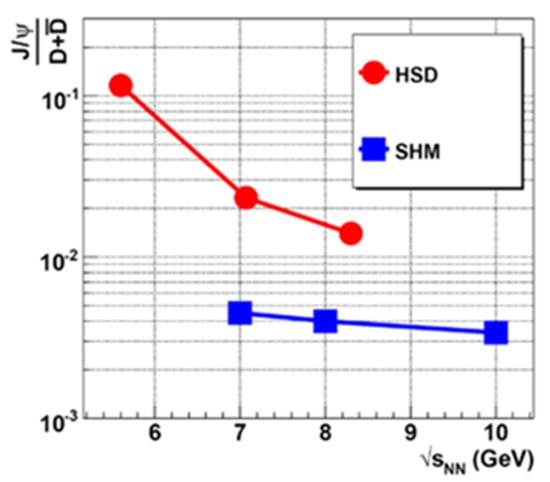 The first “smoking gun” proposed as experimental proof for deconfinement in heavy-ion collisions was the suppression of J/ψ mesons (cpairs), which were predicted to melt in the Quark-Gluon Plasma [36]. More than 20 years later, an alternative charm production mechanism was suggested within the statistical hadronization model (SHM) [37]. Within this scheme, c and quarks are created in initial hard collisions, then equilibrate within the Quark-Gluon Plasma, and finally form J/ψ mesons, D mesons, and Λc hyperons during hadronization. These charm production processes differ from hadronic scenarios, such as the ones implemented in the Hadron-String-Dynamics (HSD) transport code, which includes reactions like pp → J/ψ pp, pp → Λc p, and pp → D pp with different threshold energies of Ethr = 11.3 GeV, 11.9 GeV, and 14.9 GeV, respectively [38]. In contrast, charm production in the QGP, as considered in the SHM, does not exhibit different energy thresholds for J/ψ and D mesons. Therefore, the yields of these particles should differ for the two scenarios, particularly at threshold beam energies, as illustrated in Figure 7, where the (J/ψ)/(D + ) ratio is shown as function of collision energy for central Au + Au reactions. The red dots represent the results of the HSD code, while the blue squares stem from the SHM. The HSD results exhibit a strong increase of the ratio towards lower beam energies, because in a hadronic scenario the threshold for J/ψ production is lower than for D meson production. The SHM model results depend only weakly on collision energy. To date, no charm production in heavy-ion collisions has been measured below the highest SPS energies. Future experiments at NICA and FAIR close to the charm threshold are needed, to unravel the production mechanisms and the microscopic structure of dense QCD matter.