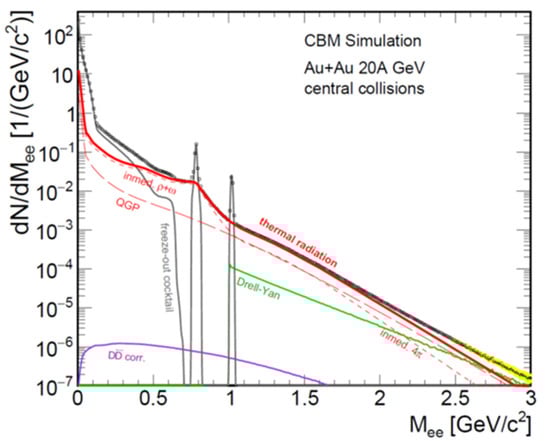 Electrons and muons are very promising probes of hot and dense matter as it is created in heavy-ion collisions, since they carry undisturbed information out of the fireball, because they are not affected by the rescattering and absorption due to strong interaction. For example, in-medium modifications of vector mesons decaying into lepton pairs can be studied by lepton spectroscopy. Moreover, the invariant mass distribution of lepton pairs directly reflects the average temperature of the fireball, because it is not blue-shifted by the collective flow, as it is the case for hadron spectra. In particular, the slope of the invariant dilepton mass distribution between 1 GeV/c2 and 2 GeV/c2 is a perfect measure of the fireball temperature, as in this invariant mass range the contributions of vector meson decays are strongly reduced. This is illustrated in Figure 8, which depicts a calculation of the various contributions to the dilepton invariant mass spectrum for central Au + Au collisions at a beam energy of 20 A·GeV [5]. The solid red curve shows the contribution of the thermal radiation, which includes in-medium ρ and ω spectral functions, and a QGP spectrum calculated using a many-body approach [40]. The NA60 collaboration has measured μ+μ− pairs in In-In collisions at 158 A GeV, and extracted a temperature of about 200 MeV from the invariant mass spectrum above 1 GeV/c2 [41]. The HADES collaboration measured electron–positron pairs up to invariant masses of about 1 GeV/c2 in Au + Au collisions at 1.25 A GeV. Nevertheless, they managed to subtract contributions from known vector meson decays, and extracted an average fireball temperature of about 72 MeV from the resulting e+e− invariant mass spectrum [42]. It is worthwhile to note that the dilepton invariant mass spectra include the radiation over the fireball evolution, and, hence, reflect an average temperature. Nevertheless, the measurement of dileptons as a function of beam energy in heavy-ion collisions at FAIR and NICA offers the unique possibility of determining the caloric curve of dense QCD matter and discovering the first order phase transition with its critical endpoint, if it exists at all.