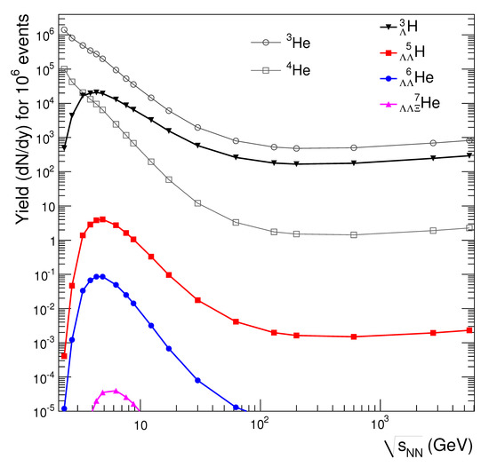 - Steinheimer, J.; Gudima, K.; Botvina, A.; Mishustin, I.; Bleicher, M.; Stöcker, H. Hypernuclei, dibaryon and antinuclei production in high energy heavy ion collisions: Thermal production vs. Coalescence. Phys. Lett. B 2012, 714, 85. [Google Scholar] [CrossRef]