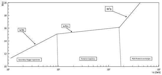 growth exceeds the linear logarithmic extrapolation to the LHC energy range. In Equation (1), is a differential cross-section of the proton–proton elastic scattering. To bring the Regge model closer to the experiment on the diffraction cone slope growth rate, it has been suggested that the slope of the Pomeron trajectory is an energy-dependent function (cf. [7]). Such a dependence can reflect the negative contribution of absorption correction due to increasing contribution of multi-Pomeron exchanges. It might also be due to Odderon presence [8], while complication of the Regge model in the form of Dipole Pomeron itself does not help [9].
