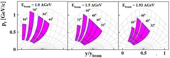 Examples of the acceptance of the kaon spectrometer in the plane transverse momentum versus normalized rapidity y/ybeam for several laboratory angles θlab (as indicated) and for various magnetic field settings at 1.0A GeV, at 1.5A GeV and at 1.93A GeV beam energy. The angular acceptance is ∆θlab = ±4°, corresponding to the width of the pink bands.