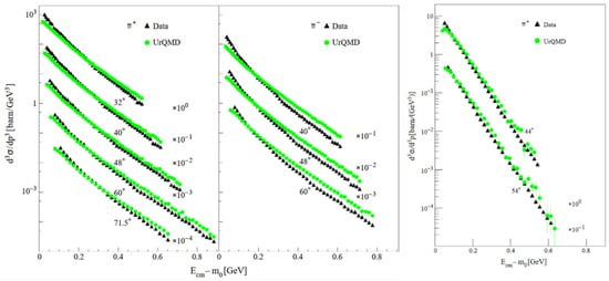 More information on pion production in heavy and light collision system can be extracted from Figure 4, which depicts differential pion production cross sections as function of kinetic energy in the c.m. system for different polar emission angles. The left and center panels depict π+ and π− spectra from Au+Au collisions at a beam energy of 1.5A GeV, respectively, whereas, in the right panel, π+ spectra from C+C collisions at 1A GeV are shown []. The data were measured by the KaoS collaboration and are compared to results of calculations with the UrQMD event generator. For the heavy system, data and model calculations differ in both yield and spectral slope. While the measured soft pion yield exceeds the UrQMD results, the yield of hard pions is overestimated by the model calculations. These discrepancies reflect the difficulty in describing properly the lifetime and spectral function of the Δ-resonance and the ΔN cross-section in the dense and hot media, as created in Au+Au collisions.