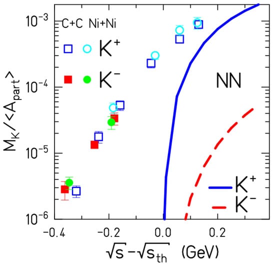 The production of strange particles in heavy ion collisions at SIS18 energies is a very promising probe of the collision dynamics and the matter properties in the reaction volume, as the available beam energies per nucleon are mostly below the threshold energy for strangeness production in nucleon–nucleon collisions. The creation of a K+ meson via the process p + p → K+ Λ p requires a proton kinetic energy of 1.58 GeV and K− mesons can be produced via p + p → K+K− pp above a proton energy of 2.5 GeV. A parameterization of the excitation function of K+ and K− mesons per participating nucleon in nucleon–nucleon collisions is presented in Figure 7 as a blue line and a red dashed line, respectively, as functions of the Q-value, i.e., the available energy above the threshold. The open blue squares and the open cyan circles indicate the K+ yields per participating nucleons measured in C+C and Ni+Ni collisions, respectively, while the full read squares and the full green dots show the corresponding yields for K- mesons [,]. Figure 7 demonstrates that kaon production in heavy-ion collisions at SIS18 energies requires processes in addition to binary nucleon–nucleon collisions. According to microscopic transport models, the production of strange particles in nucleus–nucleus collisions at subthreshold beam energies proceeds via multi-step processes in the reaction volume, involving Δ resonances, N* and pions, such as π p → K+Λ π.