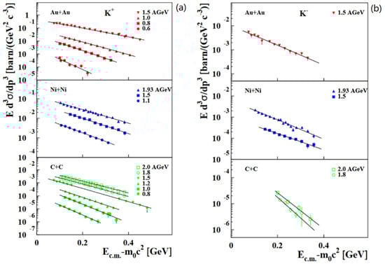 Inclusive invariant cross-sections at mid-rapidity as a function of the kinetic energy Ec.m. − m0c2 for K+ mesons (a) and for K− mesons (b) for the various collision systems and beam energies measured. Mid-rapidity data were selected by the condition θc.m.= 90° ± 10° from measurements at different polar angles []. The lines represent fits to the data (see text).