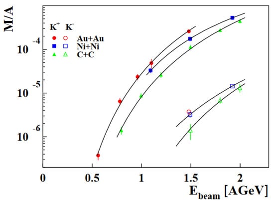Multiplicities of K+ (full symbols) and of K− mesons (open symbols) per mass number A of the collision system as a function of the beam energy. The lines represent fits to the data [].