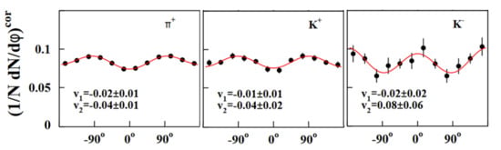 The beam energy of 1A GeV is too low to perform a high statistics measurement for K− mesons, the production of which requires 2.5 GeV in nucleon–nucleon collisions. Therefore, Ni+Ni collisions were performed at GSI with a beam energy of 1.93 A. The azimuthal angular distribution for π+, K+ and K− mesons measured by the KaoS collaboration in semi-central Ni+Ni collisions are depicted in Figure 11 []. The distributions of π+ and K+ mesons are similar but less pronounced than in Au+Au collisions, which is expected for smaller spectator fragments. However, the emission pattern of K− mesons exhibits peaks at ±180°, corresponding to an in-plane elliptic flow. This effect was observed for the first time in collisions at SIS18 energies. Although K− mesons are expected to be strongly absorbed in spectator matter by strangeness exchange reactions such as K−n → Λπ−, their strongly attractive in-medium K−N potential overcompensates absorption effects, resulting in an in-plane elliptic flow.