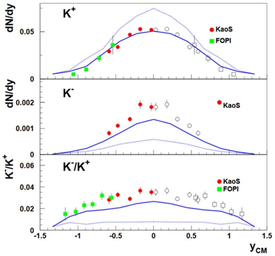 Multiplicity density distributions of K+ mesons (upper panel), K− mesons (center panel) and the K+/K− ratio (lower panel) for near-central (b < 4.4 fm) Ni+Ni collisions at 1.93A GeV, measured by KaoS (red circles) [] and FOPI (green squares) [,]. The measured data (full symbols) are mirrored at yCM = 0 (open symbols). The data are compared to BUU transport calculations []. Solid lines: with in-medium effects. Dotted lines: without in-medium effects. Taken from [].