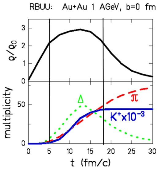 In central heavy-ion collisions at SIS18 beam energies, nuclear densities above 2 ρ0 are reached over a time span of at least 10 fm []. According to microscopic transport models, subthreshold K+ production in heavy-ion collisions also exhibits a sensitivity to the density in the fireball. This is illustrated in Figure 13, which, in the upper panel, illustrates the density reached in a central Au+Au collision at 1A GeV as a function of collision time, while, in the lower panel, the corresponding multiplicities of the created Δ resonances, pions and K+ mesons are shown. The Δ resonances are produced in the course of the collision and finally decay into pions, while the K+ mesons are created predominantly at densities above 2 ρ0, as illustrated by the two vertical lines and the blue curve representing the K+ multiplicity in Figure 13. The key mechanism for subthreshold K+ production is the accumulation of the required energy by multiple collisions of particles in the fireball, as described in the previous section. The yield of the created K+ mesons increases with the matter density according to its incompressibility.