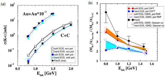 The black diamonds in the left panel of Figure 14 represent the production cross-sections of K+ mesons measured in Au+Au and C+C collisions as functions of beam energy []. The small C+C system serves as a reference, which differs from the large system only in volume and density, hence exhibiting less sensitivity to the EOS. The data are compared to results of QMD transport calculations, assuming a different EOS [,,,]. Calculations without in-medium calculations for C+C collisions overshoot the data by a factor of up to 2 (open symbols), whereas the calculations with in-medium effects are close to the data. It is worthwhile to note that the yield of K+ produced in the light C+C system does not depend on the EOS. The Au+Au data are compared with the results of calculations for a soft EOS (Knm = 200 MeV; blue dots) and a hard EOS (Knm = 380 MeV; cyan squares).