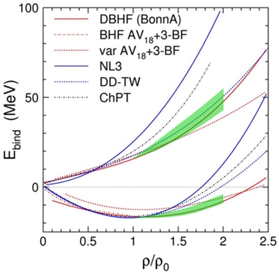 Binding energy as a function of nuclear matter density in units of ρ0. The lines represent the results of various calculations for neutron matter (upper curves) and for symmetric matter (lower curves) []. Lower green area: EOS for symmetric matter as extracted from data of the KaoS [,] and FOPI [] experiments. Upper green area: Symmetry energy Esym as extracted from the data of the ASY–EOS experiment [] added to the experimental EOS for symmetric matter (see text).