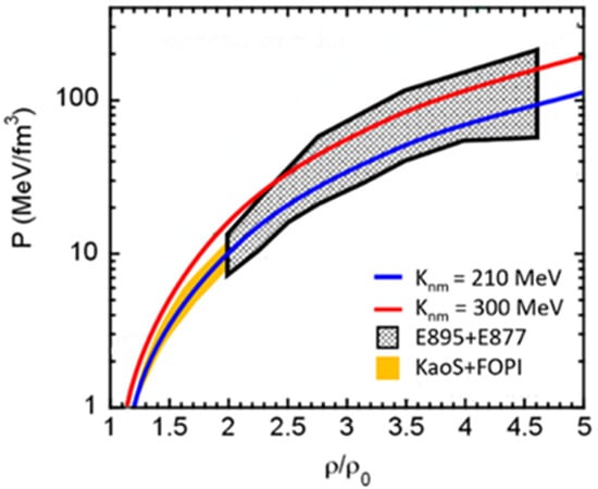 In order to contribute to our understanding of the structure of neutron stars and of the dynamics of neutron star mergers, the EOS has to be determined up to 5–6 times the saturation density []. Such densities are reached in heavy-ion collisions with beam kinetic energies between 5A and 10A GeV []. The first investigations of the EOS in heavy-ion collisions at these beam energies were performed at the AGS at BNL, where the collective flow of protons was studied in Au+Au collisions at energies between 2 and 8A GeV []. However, the interpretation of the data by relativistic transport model calculations was not very conclusive; while the transverse flow data could be reproduced under the assumption of a soft EOS (Knm = 210 MeV), the elliptic flow data seem to support a stiff EOS (Knm = 300 MeV) []. Figure 16 depicts the result of the analysis of the AGS proton flow data as a grey shaded area, plotted as pressure versus density. The blue and red line correspond to a soft and a hard EOS, respectively []. The yellow area corresponds to the EOS extracted from the FOPI and KaoS measurements as discussed above. In conclusion, Figure 16 represents the present constraints for the EOS of symmetric nuclear matter above the saturation density, illustrating that the analysis of the heavy-ion data by microscopic transport models find a soft EOS up to densities of about 2 ρ0, whereas, at higher nuclear densities, only very soft or very hard EOSs are excluded.