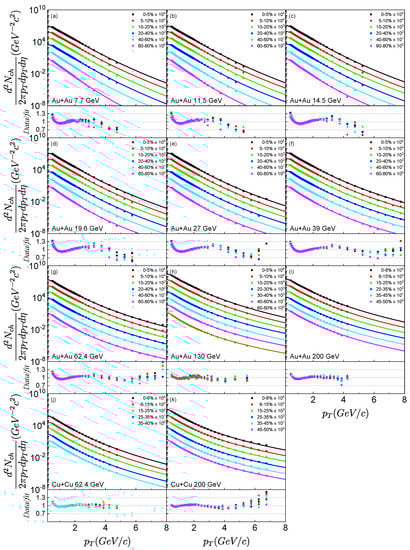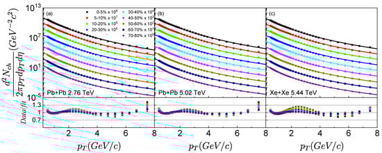 In Figure 1 and Figure 2 are displayed the results of the Tsallis distribution, Equation (4), to fit the transverse momentum distribution of charged particles at different centralities in Au + Au collisions with collision energy (BES program) from to 200 GeV, Cu + Cu collisions at and 200 GeV at the RHIC, Pb + Pb collisions at and 5.02 TeV as well as Xe + Xe collisions at TeV at LHC. The corresponding /NDF for the fits are listed in the Appendix A. The Tsallis distribution can well reproduce the experimental data of all the collision systems and centralities investigated. Noting that we have applied the cut GeV/c to the transverse momentum spectra of charged particles in Pb + Pb and Xe + Xe collisions at LHC []. To show the agreement between the data and the Tsallis distribution in linear scale, the ratios of data/fit are shown in the bottom panels of Figure 1 and Figure 2. The discrepancies are within 30% for the low collision energies and it reduces to 15% for the high collision energies. The centrality dependence of the fitting quality is not obvious at the RHIC. However, the Tsallis distribution can fit the transverse momentum spectrum better at the peripheral collisions than at the central collisions for the collision systems at LHC. This can be attributed to the medium effects for central collisions, because it is empirically known that the Tsallis distribution can fit well the transverse momentum spectra produced in p + p collisions. The peripheral collisions are more like the p + p collisions than the central collisions [,].