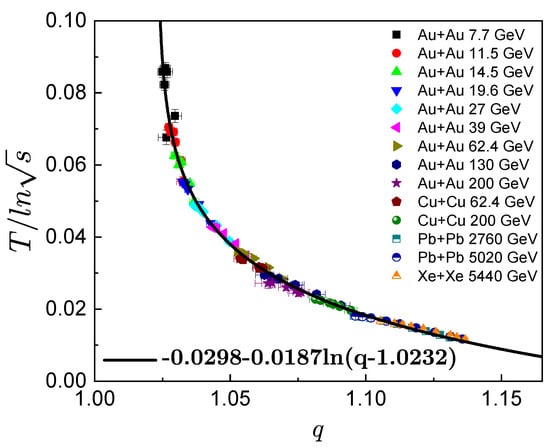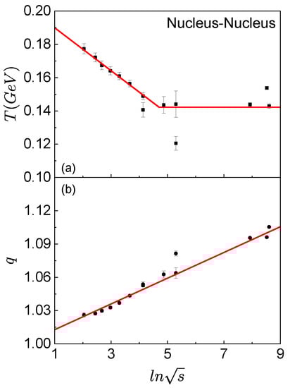 thus, it is a dimensionless variable that is suitable used in an expression like . For the temperature T, it is observed that a linear decrease from GeV to a certain collision energy and then it is approximately constant for the higher collision energies, which is the asymptotic value connected to the Hagedorn temperature, i.e., the pion mass. The lines are drawn to guide the eyes. Unlike the temperature T, the parameter q shows a linear monotonic increasing dependence on the collision energy in the whole energy region investigated. A linear fit gives shown in the Figure 3b. This indicates that the higher the collision energy is, the less the collision system reaches thermal equilibrium during the evolution and the temperature fluctuation is larger []. The parameters from the other centralities showing similar behaviors have been observed.